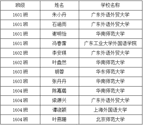 北京师范大学1人;上海外国语大学1人;华东师范大学1人;华南师范大学4人;广东外语外贸大学4人;广东工业大学外国语学院1人。