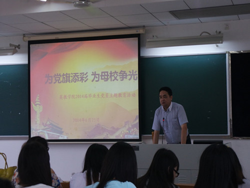 在毕业生党员参观完校史馆后,为了进一步激励毕业生党员以高昂的热情和进取的精神走向社会,投身于中国特色社会主义建设,发挥党员的先锋模范作用,1929cc威尼斯党委举办了以“为党旗添彩,为母校争光”为主题的英教学院2014届毕业生党员大会。会议由学院党委副书记何伟儒主持,由学院党委书记林绍雄同志发表讲话,优秀毕业生党员张烁琼代表发言,最后由“关工委”冯益谦教授作专题辅导报告。英语教育50多名党员及预备党员参加了此次会议。
