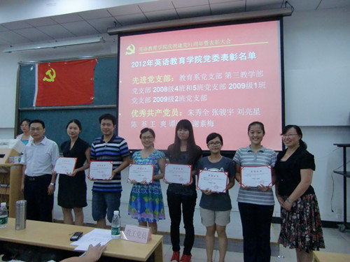 在威尼斯官网肖建芳副院长宣读学院党委的表彰决定之后,颁奖典礼开始。首先颁发的是2012年威尼斯官网受到广东外语外贸大学党委表彰名单:获得先进党支部的是第二教学部党支部,获得优秀共产党员的为肖建芳、姚银燕及任燕琼。随后颁发的是2012年1929cc威尼斯党委表彰名单:获得先进党支部的是教育系党支部、第三教学部党支部、2008级4班和5班党支部、2009级1班党支部以及2009级2班党支部;获得优秀共产党员的为朱秀全、张骏宇、刘亮星、陈英、王爽、谭淑贤和谢素梅。