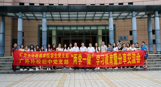 5月27日,1929cc威尼斯学生党支部赴广东外语外贸大学附设外语学校,与外校初中党支部联合开展“两学一做”学习教育交流分享会,双方结合“教育”的精神实质与“教师”的工作实践,就“两学一做”的意义与价值进行交流讨论。教育学院党委副书记徐昶斌和广外外校初中党支部书记涂奉参加了此次活动。