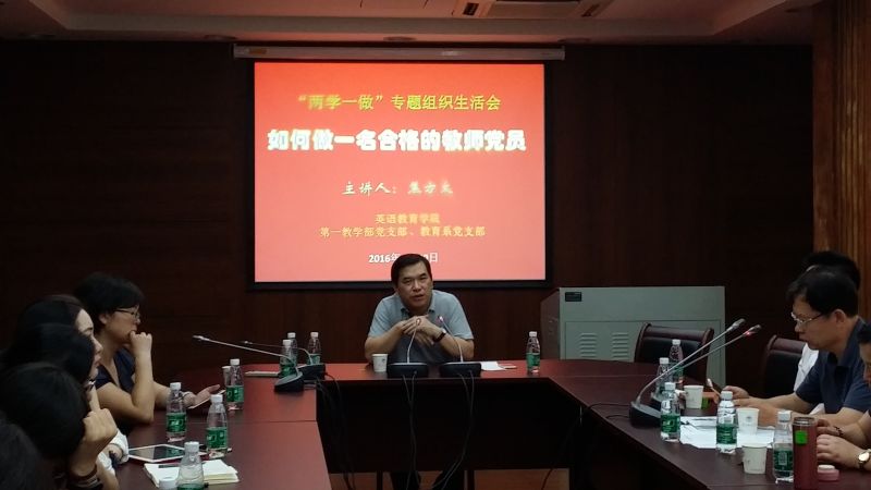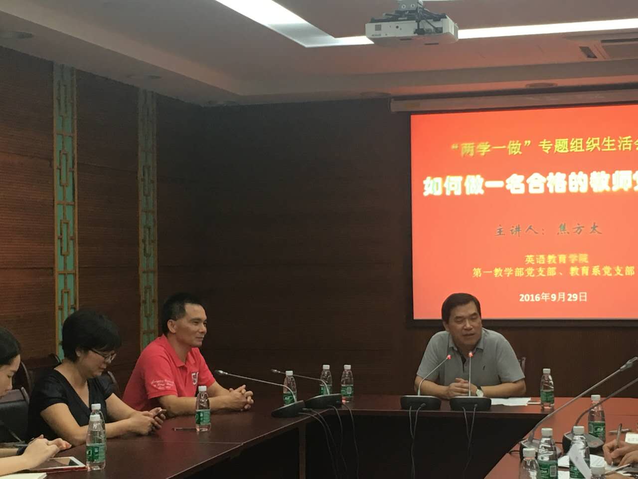 9月29日,在“两学一做”学习教育如火如荼开展之际,1929cc威尼斯党委组织第一教学部党支部、教育系党支部在北校文科基地会议室开展了"两学一做”专题组织生活会,特邀广东外语外贸大学副校长焦方太做关于“如何做一名合格的教师党员”的专题辅导报告。1929cc威尼斯党委书记林绍雄、党委委员齐湘燕和1929cc威尼斯第一教学部党支部、教育系党支部党员参加了此次专题组织生活会。会议由第一教学部党支部书记郭进军主持。