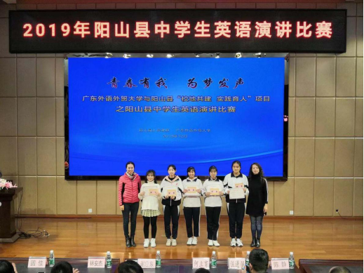 一是全力协助办好“2019年阳山县中学生英语演讲比赛”,学院深度参与活动方案的制定过程中,充分运用学院教师英语专业知识以及英语演讲方面经验助力于活动的成功举办。12月7日,学院派出肖建芳老师、江健老师专程驱车赶赴阳山县为参赛选手进行专题培训,从演讲的技巧、临场应变以及语音语调等方面为学生进行全方面的指导。12月20日,学院安排郭进军、江健、周洁、康叶钦、刘之远、陈艾舒等六位教师前往阳山县为全部52名参赛选手担任评委工作。
