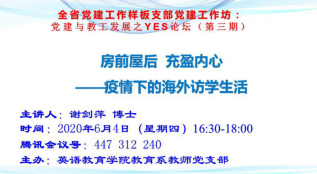 当疫情蔓延到世界各国时,抗击新冠病毒疫情成了各国面对的共同问题。教育系教师党支部中有三位老师在海外工作和访学,疫情爆发以来,支部通过腾讯会议、微信等方式和他们沟通交流,他们对海外抗疫的分享和感受构建了战疫故事汇的特殊视角。周富强老师是佛得角孔子学院的中方院长,疫情之下,佛得角孔子学院第一时间成立了疫情防控领导小组,并积极加强与驻佛使馆、中资机构、援佛医疗队等联系,加强防疫知识技能学习。周富强老师带领19位孔院员工坚守佛得角,在学生无法复课的情况下,做好线上教学,虽然有困难,但是一直在努力坚持。他说,他为祖国的发展和进步感到自豪和骄傲,决心坚守在佛得角这块小小的阵地上,克服困难,为国家争光。杨韶刚老师是埃及艾因夏姆斯大学孔子课堂的中方院长,疫情期间,身处海外,他深深感受到中国对本国公民的关爱和帮助,在全球疫情爆发期间,中国驻埃及大使馆为在埃及的中国公民筹集提供包括口罩在内的防护用品,让在海外的中国公民可以第一时间做好个人防护。通过这次疫情期间发生的点点滴滴,他真切感受了到祖国的温暖和伟大,深深体会到中国政府在这次疫情中 “有责任、有担当”,始终把人民的生命安全放在第一位;感受到了祖国在医疗和科技等方面的先进水平,以及海外的中国人对祖国的无限信任。谢剑萍老师疫情期间在英国访学,她通过各种网络新闻媒体时刻关注着祖国的动态,英国的疫情虽然缓和,但是每天感染人数与国内相比,还是令人触目惊心。每当她看到这些数据,就更加感觉到祖国的强大和祖国人民的上下一心。她相信经历这次疫情后,每个中国人会更为祖国感到骄傲,会更加爱国。