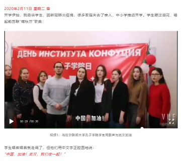 武汉疫情爆发期间,苏春老师正在俄罗斯叶卡捷琳堡乌拉尔联邦大学孔子学院担任对外汉语教师。她用日记和视频的形式记录了外国友人对中国疫情的关心和祝福,被广州图书馆微信公众号予以报道。随着疫情在全球蔓延,苏春老师仍坚守在海外利用线上直播方式为孔院学生授课。她表示,“这次疫情让我感受到了祖国的伟大,感谢祖国和学校学院党委对我的关怀和关爱。”