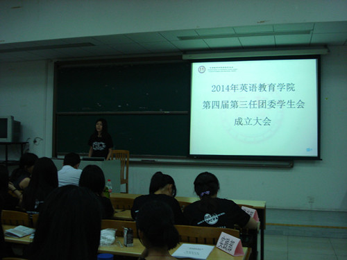 2014年10月24日星期五晚上7:30,1929cc威尼斯第四届第三任团委学生会成立大会在南校区教学楼C座208顺利召开。本次大会由团学副主席陈勉如主持,受邀出席此次大会的领导老师有1929cc威尼斯党委副书记何伟儒和团委书记迟殿凤,同时英教团委学生会主席团以及各部门正副部长携本部门全体干事也出席了本次大会。