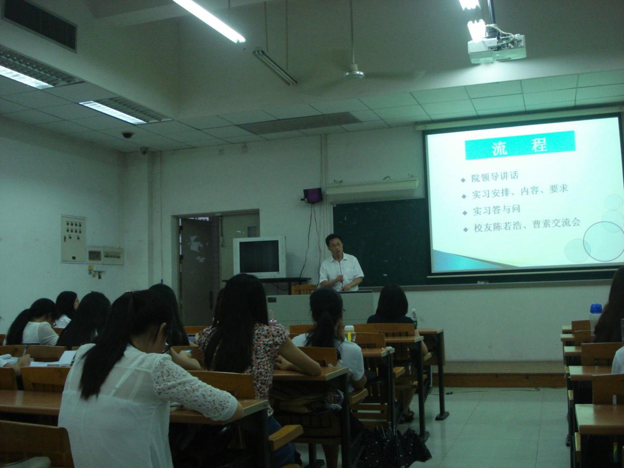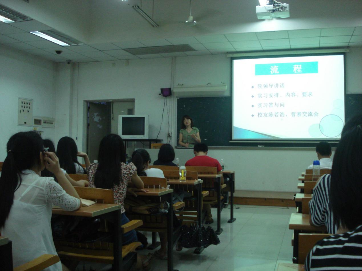 大会开始,谢剑萍老师简单介绍了本次动员大会的具体流程:院领导讲话;实习安排、内容和要求;实习问与答;以及校友陈若浩、曹素交流会。