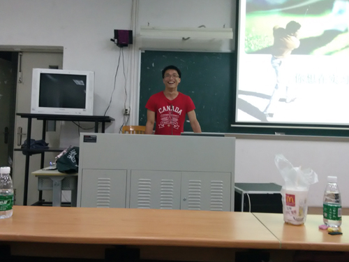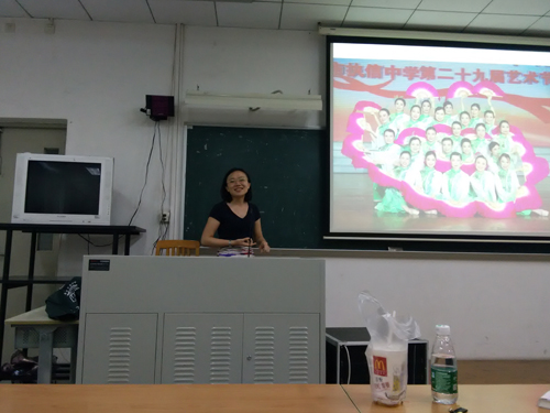 最后,动员大会迎来了最后一个环节“校友陈若浩、曹素交流会”。陈若浩师兄与曹素师姐两人都是2010年毕业于英教的校友,同时,他们二人现在也都在广州执信中学任教。陈师兄以一则“柚子”笑话开场,现场气氛一下子活跃了起来。陈师兄与我们分享他个人的大学实习以及就业经历,他很用心地将自己的简历搬上PPT,与师弟师妹交流实习就业心得体会并且分享他为人师的经验感悟。例如:jump out of book、reflection、尽量做到student-centered等等。他希望师弟师妹能做一个有自己独特优势且有担当的人,并祝愿师弟师妹能顺利完成实习工作。随后,曹素师姐也上台与我们共同分享了她忙并快乐着的教书日子。她认为“老师是获得幸福感最快最直接的一种职业”,希望师弟师妹能够在实习中享受当教师的快乐并为以后正式走上职业道路积累经验。同时,她也给予师弟师妹许多中肯的建议。