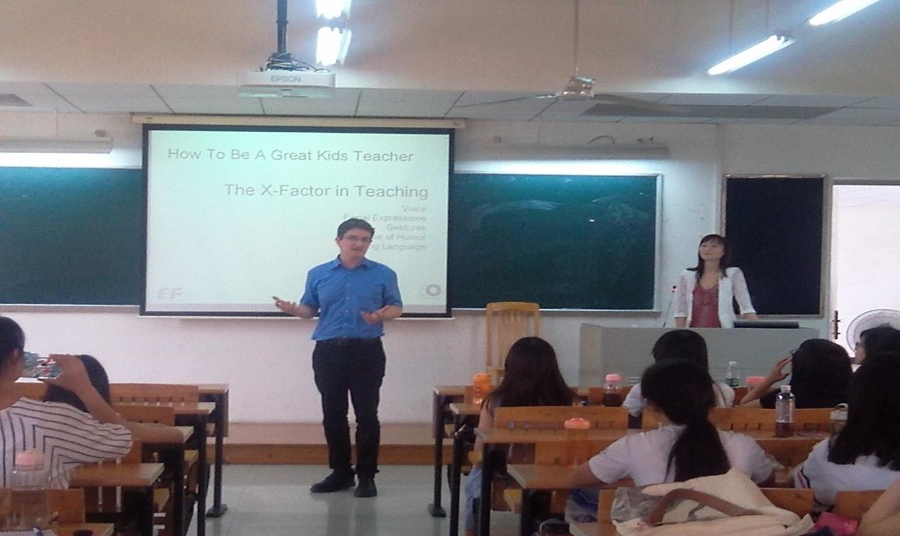 9月10日上午南校区教学楼F309,英孚教育戚娇莹、Steven Hogan以及余颖昕为威尼斯官网2012级教育系学生作了实习教育讲座。该讲座由教育系主任谢剑萍主持,副院长熊涛出席了此次讲座。