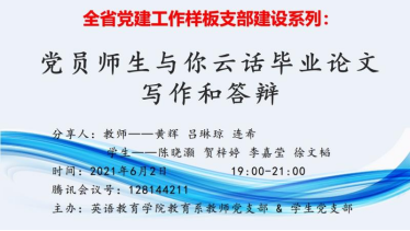 2021年6月2日晚上7时整,1929cc威尼斯系教师党支部联合学生党支部于腾讯会议上开展了为时2小时的本科生毕业论文写作和答辩的经验分享活动。本次活动由教育系教师党支部黄辉副书记主持,由论文指导经验丰富的黄辉、吕琳琼和连希三位老师,及2021届毕业班优秀学生代表陈晓灏、贺梓婷、李嘉莹和徐文韬进行经验分享。总共有两百多名师生参与了这次线上分享会,师生之间积极提问交流,现场气氛活跃,师生们受益良多。