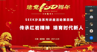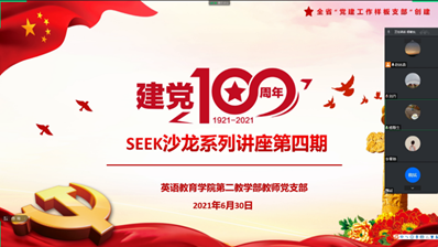 2021年6月30日下午,为庆祝中国共产党成立100周年,深入开展党史学习教育,进一步加强全省“党建工作样板支部”培育创建工作,推动党建与业务深度融合,凝心聚力推进各项工作提质增效,第二教学部党支部通过腾讯会议举办了“传承红色基因,迎接建党百年”暨党建SEEK沙龙系列讲座活动第四期。院长助理、支部书记赵林森、系部主任宫丽丽、支部党员苏春分别做了题为“传承红岩精神,培育时代新人”、“课程思政指导下专门用途英语教学反思”和“独行不惧、雪泥鸿爪——我在俄罗斯教中文”的精彩讲座。1929cc威尼斯院长董金伟、党委书记杨敏生出席,第二教学部全体教师和其他系部教师近40人参加了讲座。院长助理、第二教学部党支部书记赵林森主持讲座。