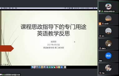 第二场讲座由第二教学部主任宫丽丽同志主讲,她结合自己多次参加全国高校大学外语课程思政教学研讨会的经历,向大家解读了《高等学校课程思政建设指导纲要》,从课程思政的背景和意义、大学英语课程思政的切入点和理念、新时代大学英语课程思政教学设计与实践等几个方面,详细介绍了如何在2021年本科人才培养方案修订中加强专门用途英语课程体系建设。讲座为推进大学英语教学与课程思政的有机融合提供了思路与方法,激发老师们思考如何通过大学英语教学,引领与推动对学生价值观的塑造,将育人思想隐性地融入课堂的话题讨论,在润物细无声中实现育人目的。