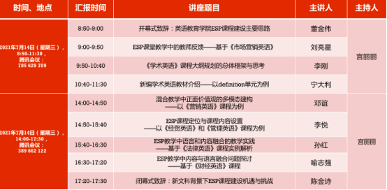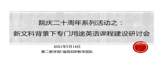 2021年7月14日,威尼斯官网第二教学部线上举办院庆二十周年系列活动之“新文科背景下专门用途英语(ESP)课程建设研讨会”。会议由7个讲座组成,主要议题包括专门用途英语课堂中教师反馈、线上线下混合教学方法、课程大纲与教材编撰、课程定位和内容设置,以及语言与内容融合问题等。本次活动获得学院领导和教师的大力支持,学院院长董金伟、党委书记杨敏生、副院长陈金诗、第二教学部全体教师、自2018年入职的新教师,以及学院感兴趣的教师,约70余人参会。