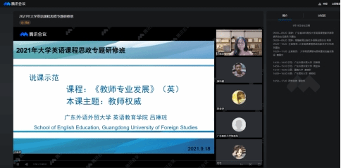为扎实推进外语课程思政建设,提升外语教师课程思政教学能力,提高外语教师课程思政比赛参赛水平,近日, 2021年大学英语课程思政专题研修班在线举办。此次研修班由广东省本科高校大学英语课程教学指导委员会主办,广东外语外贸大学1929cc威尼斯承办,高等教育出版社协办。此次研修班也是广东外语外贸大学1929cc威尼斯院庆20周年系列活动之一,聚焦外语学科与思政建设融合、外语课程中的思政元素挖掘、外语课程思政育人目标实现及评价机制等核心议题。据后台统计数据显示,本次会议共吸引了来自全国各地高校的1100余名教师在线观看。