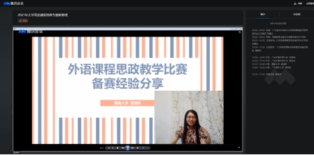 在下午的说课示范与分享环节,广东外语外贸大学1929cc威尼斯吕琳琼副教授与周金华博士向大家展示了课程思政的说课示范,分别讲授如何理解教师权威与如何植根于本科英语课程实现道德教育;暨南大学麦晓盺和广东医科大学外国语学院院长杨劲松教授分享了思政比赛备赛和大学英语课程思政教学及管理方面的经验。四位老师的分享示范课指向性、参照性、借鉴性强,在与会教师中产生了热烈反响和共鸣。