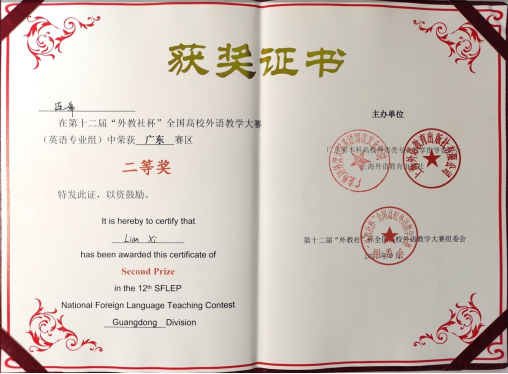 近日,第十二届“外教社杯”全国高校外语教学大赛(外语类专业组)广东省赛区在广州新华学院举行。1929cc威尼斯教师连希荣获第十二届“外教社杯”全国高校外语教学大赛广东赛区英语专业组二等奖。