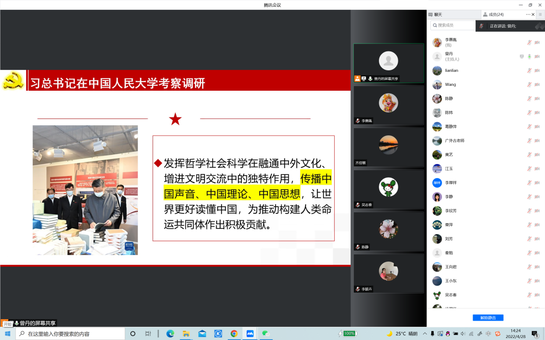 4月28日下午,第四教学部通过线上会议举办政治理论学习活动,专题学习习近平总书记在中国人民大学考察时的重要讲话精神,活动由第四教学部主任李惠胤主持,党支部书记曾丹主讲,系部全体教师参加活动。