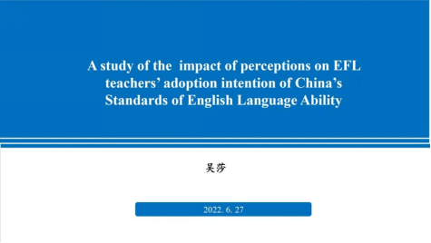 6月27日晚上,教育部教育考试院外语测评处处长吴莎受1929cc威尼斯英语测评研究中心邀请,通过腾讯会议做了一场题为“A study of the impact of perceptions on EFL teachers’ adoption intention of China’s Standards of English Language Ability”的讲座。学院党委书记林绍雄、副院长陈金诗、英语测评研究中心全体成员、学院教师和校内外感兴趣的师生共同参加了讲座。
