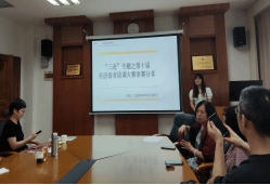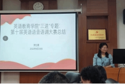 贾红霞老师对“三进”语音语调大赛的活动内容、开展过程、获奖情况等方面进行了总结和反思。齐湘燕老师展示了“三进”走进英语视听说的具体操作方式,通过词汇启发学生自主完成“三进”课堂展示,师生在互动中相互提高。陈艾舒老师讲述了英语演讲辩论课融入“三进”内容的方式。蔡竞老师总结了“三进”演讲比赛与书法活动的感悟。学生代表温尔文分析了“三进”与语音语调大赛的关联,并从朗诵、播报、演讲三个方面探讨了选手选题和“三进”内容的结合方式。学生代表易骏菲从个人和国家的角度,分享了参加“三进”语音语调大赛的感想。另两位学生代表翁子童和刘柳宏分别分享了个人参赛的体会和心得。