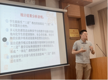 除了以上活动汇报展示,刘洋老师总结汇报了“三进”教改项目的成果,并对“三进”活动实施的效果进行分析,指出提升“三进”教学效果的有效方式是设置合理的“三进”内容,开展多元化的课堂思政活动,形成专业/思政一体化的“三进”教学体系,提高教师和学生的参与程度。