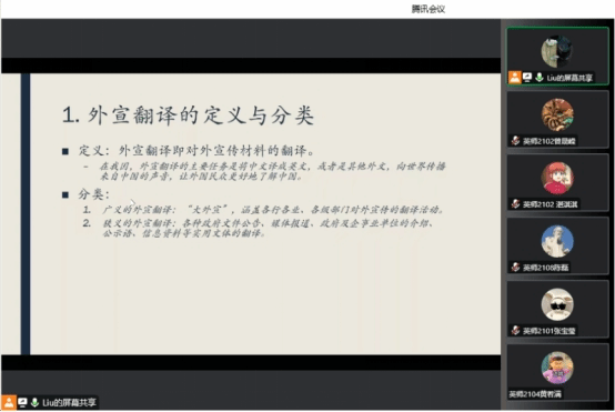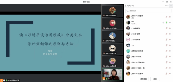 为进一步帮助同学们深刻理解习近平总书记治国理念,并提升翻译实践能力,1月5日下午,1929cc威尼斯线上开展了《习近平谈治国理政》英译本赏析“三进”专题系列讲座,第四教学部教师刘芳作专题讲座,2021级英语师范系学生参与此次讲座。