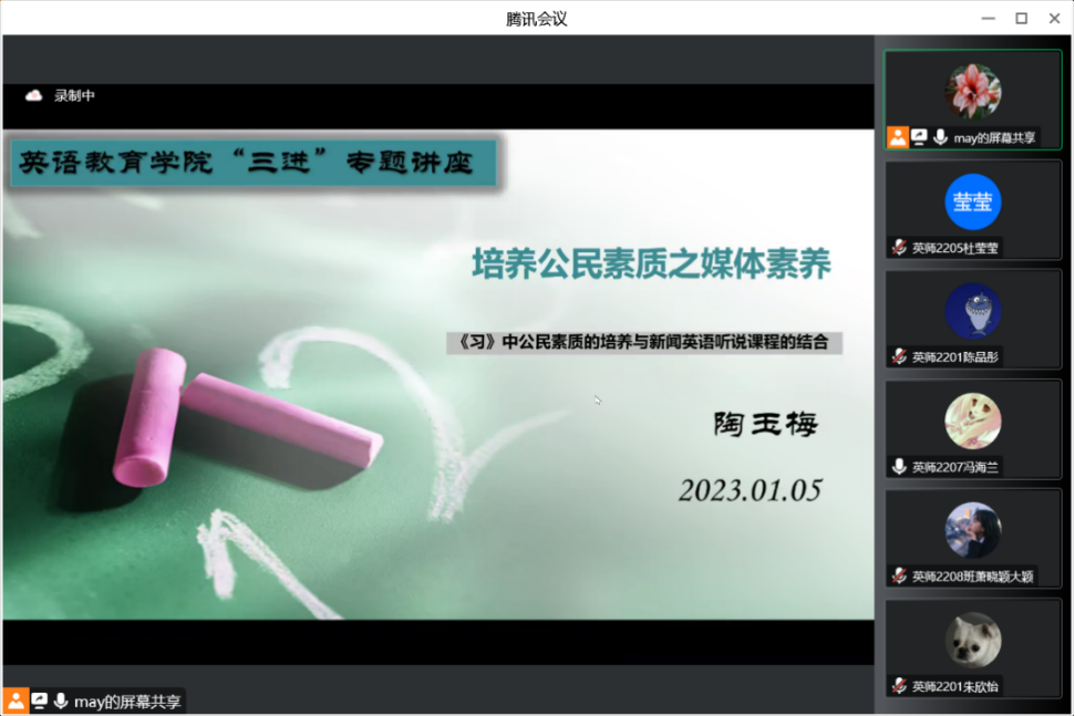 为进一步深化同学们对《习近平谈治国理政》的理解,提高同学们的公民素养,1月5日下午,1929cc威尼斯于线上开展读《习近平谈治国理政》精选听说“三进”专题讲座,讲座由第三教学部陶玉梅老师主讲,2022级全体同学参与本次讲座。