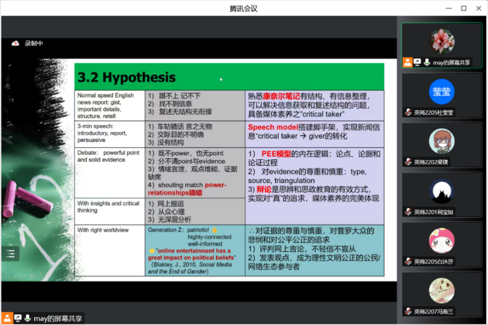 陶玉梅以几则英语新闻为例,剖析其内部结构,带领同学们批判地解读媒体新闻,培养学生思辨和产制资讯的能力。她从新闻的真实性、准确性、时效性三点切入,分析了当代新闻媒体存在结构缺失、证据缺席、无深层分析等问题,并提出康奈尔笔记法、思辨逻辑和思政教育三个课程支柱方法提高学生分析新闻的能力。