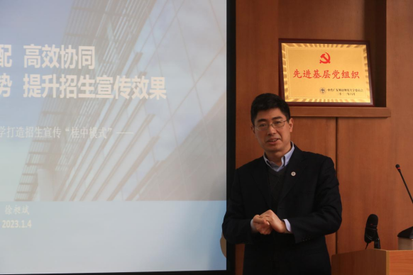 徐昶斌作《精准匹配高效协同;发挥学科专业优势,提升招生宣传效果》主题分享,介绍金融学院在本科招生宣传工作中创新的“桂中模式”。近年来,金融学院致力于加强与中学的沟通与合作,与南海桂城中学合作共建“金融特色高中”项目,开设了“金融特色课程”、举办了“暑期金融素养夏令营”等活动,在培养中学生金融素养的同时,也提前在学生心中构建关于广外的认识,扩大广外与金融学科的社会影响力。徐昶斌指出,适时与中学开展深度协作,实现资源共享,有助于为广外培养潜在优质生源,为衔接好高中与大学的培育体系,助力教育教学高质量发展打下坚实基础。此外,徐昶斌还介绍了金融学院赴汕梅两地开展招生宣传工作的情况,分享了招生工作经验体会。