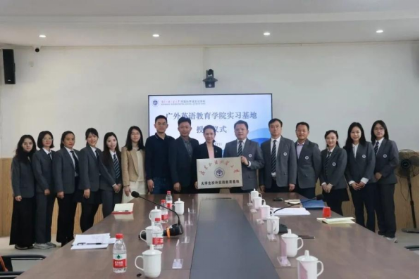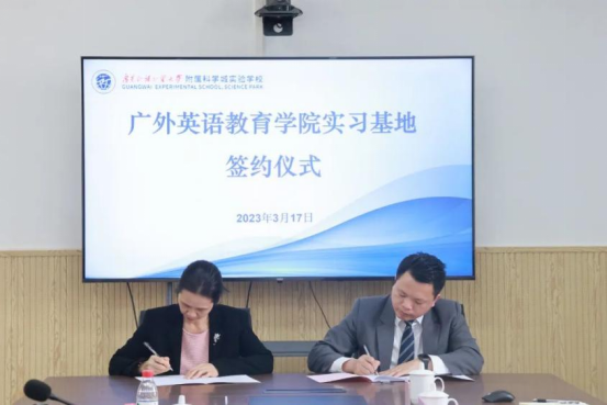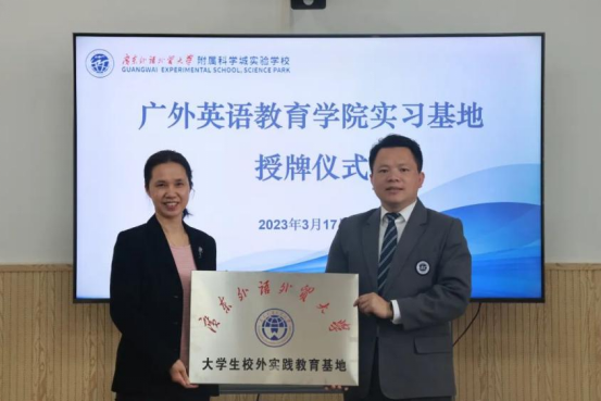 3月17日上午,广东外语外贸大学1929cc威尼斯与广东外语外贸大学附属科学城实验学校签订大学生校外实践教育基地的协议并举行授牌仪式。 广东外语外贸大学1929cc威尼斯骆银花书记、刘亮星副院长、刘洋博士,广东外语外贸大学国际学院出国事务部办公室黄奕璇主任,广东外语外贸大学附属科学城实验学校周小飞校长、陈常林副校长、庞证明副校长、宋丽范主任、陈璐主任、胥茜主任等领导以及英语科组全体老师出席了此次仪式。