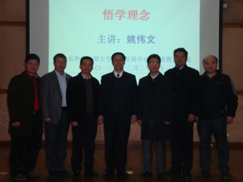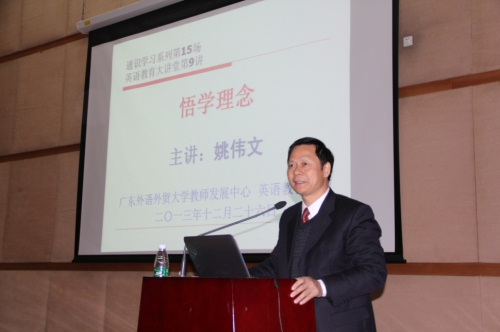 讲座之前,广东外语外贸大学副校长何传添教授为姚伟文督学颁发客座教授聘书,并对姚督学的到来表示热烈欢迎。姚督学的讲座分为悟学和学悟两个部分。在介绍第一部分关于悟学的观点时,他先为大家解释悟学的含义及怎样的课堂是悟学式课堂。接着,他先后谈论了悟学的主张、本质、精神、道路、理解、视野、方略、过程、要求、环境、克服、境界共12个方面的内容。在介绍悟学的主张时,姚伟文督学说:“我们学习应该从拥有文凭向拥有能力转变,要富有实践精神、拥有一颗感恩的心,带着感恩的心去学习会让学习更有动力。”“什么是悟学的本质?那就是说要用自己的语言来说话,用自己的文字来写文章,养成独立思考的习惯。”姚伟文说:“教育对于整个人类来说都具有重要的意义,人为本、爱为魂、悟为根、创为要。鼓励创新,探索真理。”此外,他还说,无论是一个人还是一个国家,想要获得成功都要讲究方法。“学习要讲求理解,做个明白人,干我所爱,爱我所干,要大胆地去干自己想干的事,不要怕别人嘲笑。我们同学要大胆地跳出自己现在的框架,去看更广阔的世界,因为视野是非常重要的,没有视野就没有高度。所以同学跳出英语学英语是很重要的。”在谈到悟学的过程时,姚伟文督学强调了学习过程和教学过程,学习能够增强意识、责任、能力、气质。当然在悟学中,环境是很重要的,它讲求学习的环境跟时机,因此,也要克服懒人之想、非主人之想,在这个过程中不断追求,达到学习和认识的境界,提高综合素质。他还说,我们应着力建设学习型社会和构建终身教育的体系及理念,做到终身学习,在学习中快乐且健康地成长,促进社会的和谐发展。