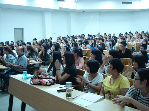 本次讲座主要分为两大环节。在第一环节中,王桂珍教授采取互动的方式灵活地引导同学们去思考语音语调学习的必要性和重要性。王教授指出,在语音语调的求学之路上存在着通往成功的八大因素,这八大因素分别是:passion、work、focus、push、ideas、improve、serve、persist。她同时鼓励大家要珍惜并充分利用大学四年的美好时光,学会从零开始,追求卓越。此外,王教授从“是什么” 、“为什么” 、“怎么做”三个角度全新定位了英语发音的学习。从王教授的讲述中,我们可以认识到好的发音是接近甚至超越native speaker的标准发音,而发好音的目的在于夯实听说基础、能够轻松理解世界各地英语使用者的发音、提高英语交际能力。王教授还特别强调了想拥有Good Pronunciation需要注意的三点:发好每个单音,语流流畅,语调正确。王教授精彩的演讲和独到的见解,博得了现场热烈的掌声。