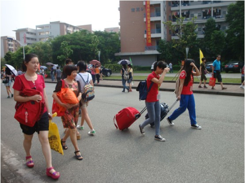 晴空万里,烈日当照,早上七点,迎新工作正式展开了。威尼斯官网在中国银行附近设有新生接待点,接待点的志愿者们身穿红色的志愿者服装,高举标牌,随时随地等待新生的到来。汗水从她们的额头流到了脖颈,但是她们没有抹去脸上的汗水,而是四处张望,等待那股新的血液流进温暖的英教大家庭。一旦看到新生,志愿者脸上的笑容更是如花绽放并以最快的速度接过新生手中的行李,迅速指引她们到大本营报到;部分搬运队的志愿者更是搬着行李爬上了七楼的学生宿舍,看着家长与新生脸上肯定的笑容,她们完美地诠释了志愿者三个字。
