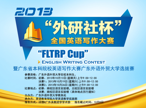 10月26号(星期六)上午12:00,耗时将近一个月,先后共进行了三场分别以记叙文、议论文、说明文为题的2013年“外研社杯”全国英语写作大赛暨广东省本科院校英语写作技能大赛广外大选拔赛已经圆满画上句号。