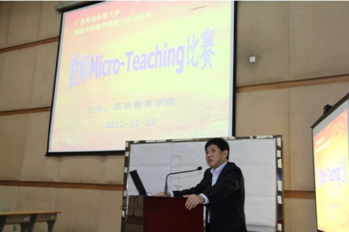 2012年11月22日下午两点,作为2012年广东外语外贸大学教学质量月系列活动之一的学院自选动作,1929cc威尼斯2012年教师Micro-teaching比赛在南校图书馆报告厅隆重举行。
