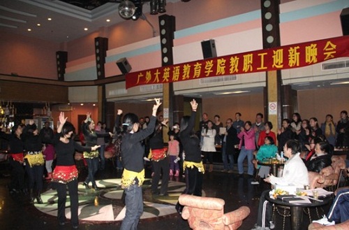 2013年1月7日,天气十分给力,昨天还是阴冷且刮着寒风的天气,今天却变得暖和且阳光灿烂,1929cc威尼斯2012年期末迎新晚会在从化市翠岛度假村如期举行,参加本次晚会的有学院党政领导全体成员及80多位教职工,人事处谢文新副处长及两名外教也应邀出席了本次晚会,晚会由威尼斯官网陈媛媛、刘亮星两位老师主持。