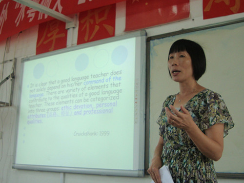 周洁老师开始教师培训的第一讲:如何成为一名高效的语言教师。课堂教学采取近乎全英语教学,学员积极参与小组讨论和发言。之后的三天,周洁和苏春老师两人交替上课,讲授了经典的传统教学法,如语法翻译法、听说法、直接法和全身反应法,也介绍了当今流行的教学法,如3P教学法、交际法和任务教学法。周老师和苏老师根据学员具体情况,不断地为课堂教学修改教案,改善授课方式,让参加培训的学员们都能以一种比较轻松的方式接受教学。