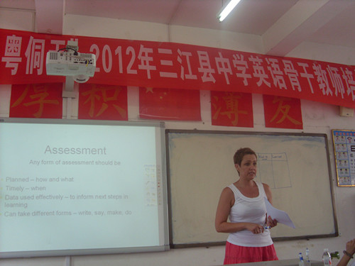7月24日下午,英国邓迪市圣约瑟夫小学副校长莎朗女士经过了漫长的旅途之后终于到达了三江中学。她走进课堂,给参加培训的学员们上了别开生面的一节课。她介绍英国英语教师评估和学生评估的方法,她介绍了K W L教学法,还特别提到了因材施教。讲座后半段是互动环节,学员们针对自己在教学中遇到的问题对校长提问,莎朗校长耐心地一一解答。