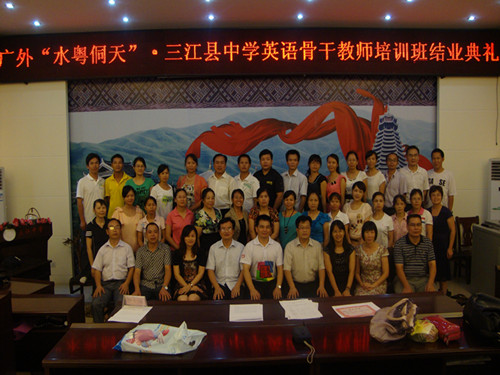 2012年7月24日到7月27日,广外大“水粤侗天”广西三江县中学英语骨干教师培训班顺利进行。此次教师培训是广外大1929cc威尼斯“水粤侗天”服务队利用大学生暑期三下乡期间,与当地教育部门一起,开展的一次中学英语教师专业发展培训项目。这是大学生暑期“三下乡”活动的新尝试,是教育扶贫,把城市的优质教育资源引向乡村的一次创举。