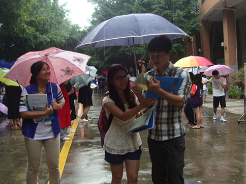 早上7时,辅导员迟殿凤老师与七名志愿者带上资料赶往北校。雨下得很大,老师和志愿者们冒着雨把一袋一袋的资料搬往咨询摊位,咨询摊位布置好。尽管很累,但是自愿者们坚持站在雨中派发宣传小册,耐心地回答家长的问题,那雨中的微笑是如此的美丽,让人难忘与感动。