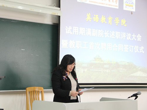 首先由肖建芳、吴岩(由王润梅老师代读)分别就其担任副院长的试用期间各项工作做了述职报告,学院全体教职工在听取两位述职报告基础上进行了认真评议。