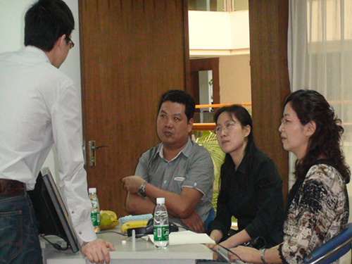 蓝鸽公司应用研究所推广中心主任李征华热情地接待了调研组的老师。李主任带领着应用研究所的成员,详细地介绍了蓝鸽语言实验室教学系统的新功能以及蓝鸽外语学习平台的具体模块和功能。他首先介绍了蓝鸽语言实验室的最新研发的成果——听写教学模块和口语训练模块,然后,他以教师的身份和学生的身份,介绍了蓝鸽开发的外语学习平台的各个模块和功能,尤其是如何利用该平台进行视听说试题的编制、作业发布,以及如何进行写作教学的应用。随后,双方就如何应用外语学习平台开展视听说课程教学和专业英语的教学进行了交流。