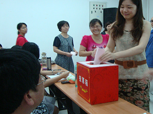随后,大会选举投票正式开始,大会主持人清点到会人数并发出选票,在监票人员的监督下,教职工们认真填好选票并有序地投下手中那神圣的一票。