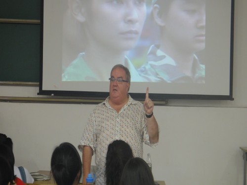讲座伊始,Dr Nicholson巧妙地运用“半杯水”的故事引出了当代大学生的不同生活态度:悲观与乐观。悲观的人只看到那半个空杯中的作业多,没时间,学习无趣等等不好的一面,而忽视了半杯水中存留的好的一面,如:“我是一名光荣的广外大学生”、“我很聪明,否则我不能成为广外大一员”、“我是父母的骄傲”、“我为我是中国人而自豪”等。Dr Nicholson用这个比喻形象地阐明了大学生活是否快乐是由我们自己来选择的,而我们应当选择乐观地生活。
