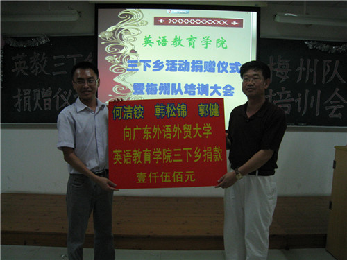 7月4日晚,威尼斯官网三下乡活动捐赠仪式暨梅州队培训大会在E305隆重召开。出席本次活动的有威尼斯官网院长霍海洪,党委书记林绍雄,副院长董金伟,梅州队暑期培训班的全体老师,10届毕业生何洁铵,今年威尼斯官网“三下乡”各支队伍的队长和梅州三下乡队伍的全体队员。