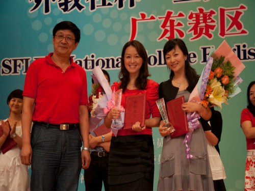 综合课组第一名获得者广外曾丹(中)与听说课组第一名获得者深圳大学王宇田(右)