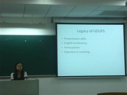 分享会伊始,刘烨婷师姐便概述了她从2005年到现在的主要经历:2005年至2009年就读广东外语外贸大学主英语教育专业;2009年至2011年在美国费城的宾夕法尼亚大学主修对外英语教学专业(TESOL);2011年到2012年参与工作;2012年至今则是攻读宾夕法尼亚大学教育语言学的博士学位。刘烨婷师姐还为我们展示了美国费城及其大学的一些照片,向在座同学分享着在美生活的点点滴滴。刘烨婷师姐表示,广外留给她的积淀使她在美学习期间更有自信,其一就是展示能力。广外在学生间素来有着“CPU”(Crazy Presentation University)的美誉,正是这种锻炼,使得刘烨婷师姐在美做展示任务时能够驾轻就熟。此外,在广外中培养出来的英语能力、合作能力以及教育的专业经验都使她获益匪浅。