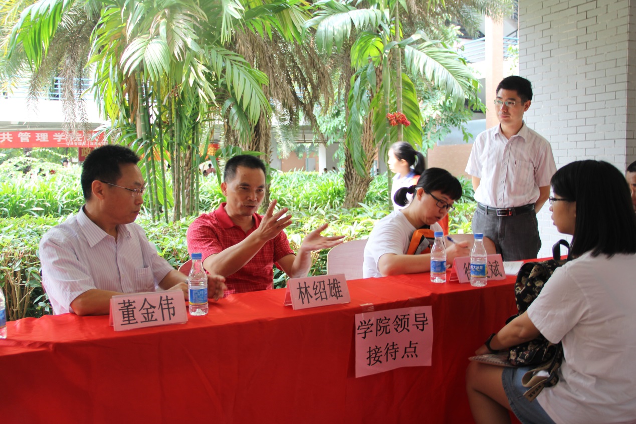 星期日,广东外语外贸大学1929cc威尼斯迎来了朝气蓬勃的2015级新生。本次英教新生的报到点位于南校区南苑8栋架空层,出席迎新接待处的领导嘉宾有1929cc威尼斯院长董金伟、党委书记林绍雄、党委副书记徐昶斌、办公室主任曾国华、辅导员迟殿凤和林泽龙。