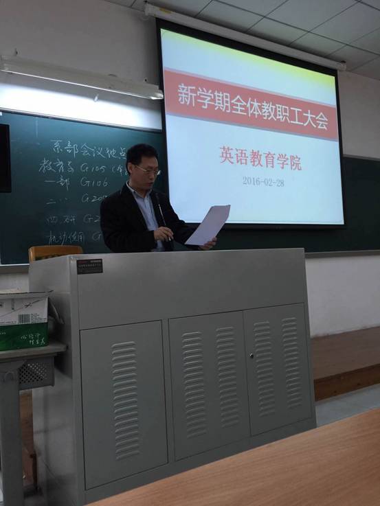 2016年2月28日,1929cc威尼斯在教学楼G105召开2016年新学期全体教职工大会,对新学期的相关工作进行部署,相关院领导与学院全体教职工参加了此次大会,会议由党委书记林绍雄主持。