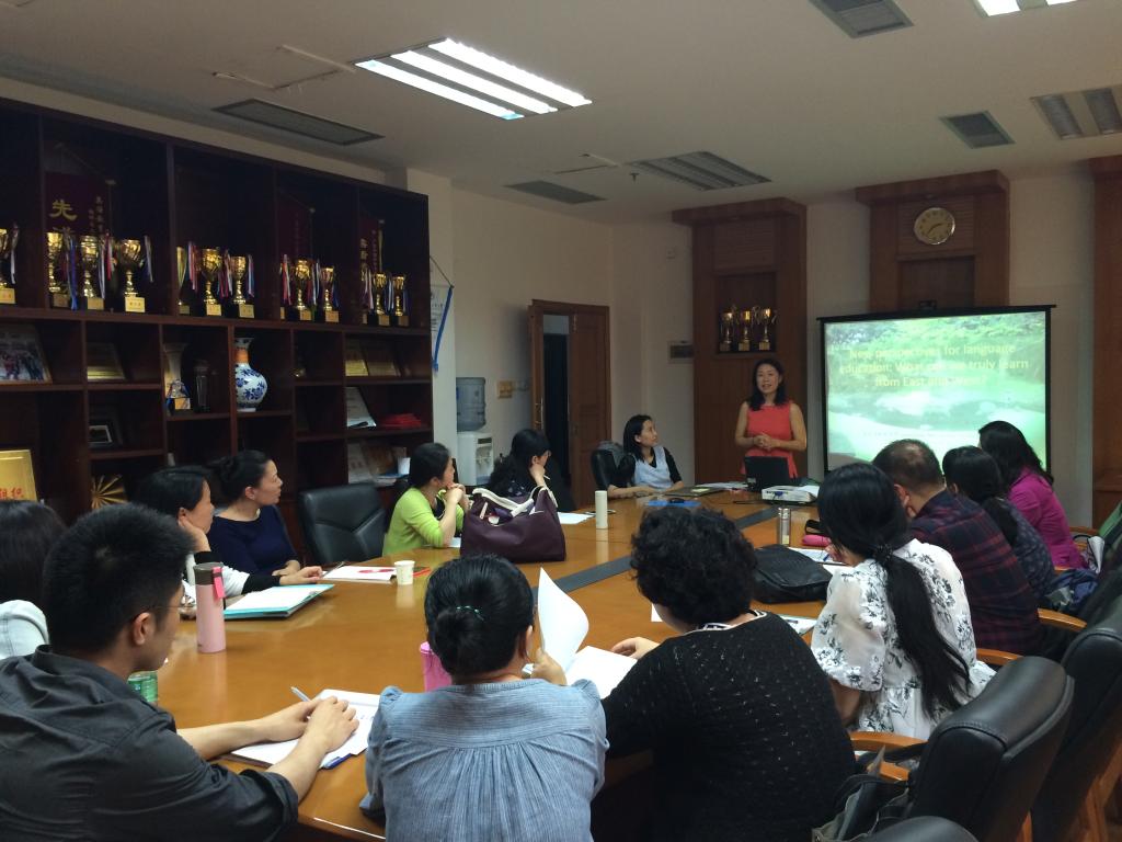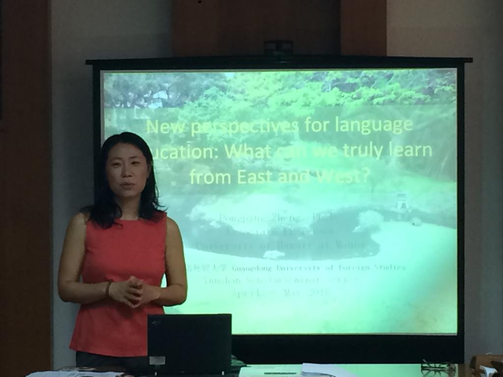 为推动威尼斯官网英语教师的专业发展,教师发展中心联合1929cc威尼斯近期推出了英语教师专业发展工作坊,邀请广外大云山讲座教授郑东萍博士开展系列讲座“NewPerspectives on Language Education: What can we truly learn fromEast and West?” 郑东萍教授于2006年获得University of Connecticut教育心理学博士,现任夏威夷大学二语研究系副教授。主要研究应用生态心理学,对话学,分布认知及语言来扩张以人为中心的传统二语习得理论。具体课题研究包括虚拟游戏空间环境对语言认知的影响,和以移动无限通讯技术为平台的游戏设计对扩展认知与学习空间,以及社会文化参与于认知的潜能的影响。