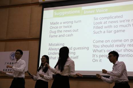 据了解,此次比赛的主题是“教师指导,学生参评,共奏广外最强音!”面向广外2015级非英语专业学生。经过激烈的初赛和复赛,最终进入此次决赛的队伍有8支,分别来自南北校区不同学院和专业。进入决赛的8支队伍为我们带来了一场别开生面的英语课堂展示盛宴。为体现这次比赛的公正公平性,未进入决赛的部分复赛队伍成员受邀当大众评委。