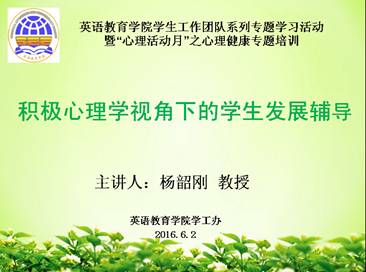 杨韶刚结合实例对大学生的行为问题与原因进行分析,他认为当下的大学生作为“一只脚迈进初级知识分子”,应该要“铁肩担道义”,而老师则应该把正能量传递给学生。他建议应该加强对大学生的抗挫折教育和有效的人际关系教育,并鼓励大家成为“最好的自己”。